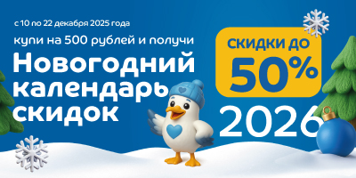 Новогодний календарь скидок выдается с 10 по 22 декабря 2025 при покупке от 500 рублей. Воспользоваться Календарем скидок можно с 24 по 31 декабря 2025 года. Количество новогодних календарей скидок ограничено. Цены указаны в рублях. Акционная цена действует только при предъявлении календаря скидок со штрих-кодом, действующим в день акции. Количество товара ограничено и равно товарному запасу, скидка не суммируется со скидкой по карте "Ледяное сердце". Начисление и списание бонусов не распространяется на акционные товары. Акционные товары могут быть представлены не во всех магазинах. Организатор имеет право досрочно прекратить акцию в связи с отсутствием товарного запаса. Подробная информация на сайте www.ледяное.рф