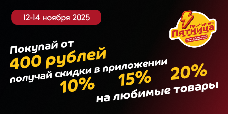 Сроки действия акции с 12.11.2025 по 14.11.2025. При совершении единоразовой покупки в зависимости от определенной суммы в рублях покупателю дается право выбрать по своей инициативе 1 (один) товар в Мобильном приложении «ледяное сердце», на который в течение 7 календарных дней в период проведения акции будет распространяться определенная скидка от цены, указанной на ценнике: от 400 руб. – скидка 10%, от 750 руб. – скидка 15%, от 1500 руб. – скидка 20%. После совершения покупки покупатель может активировать скидку в Мобильном приложении. Скидка действует 7 дней с момента покупки, после обнуляется. Полные условия акции "Любимый товар в мобильном приложении".